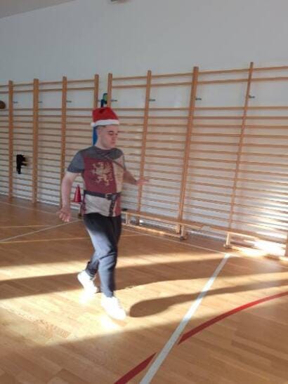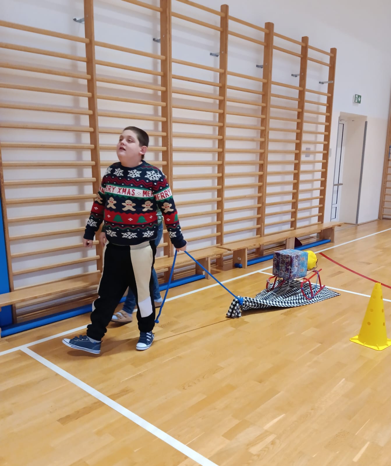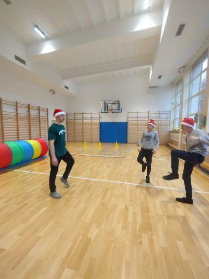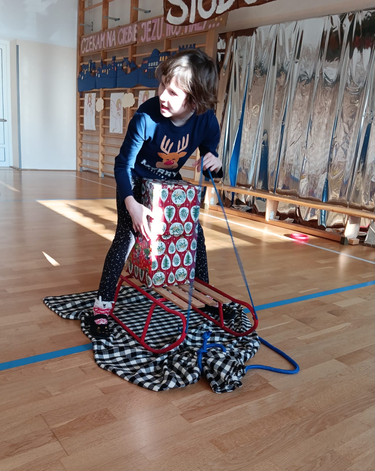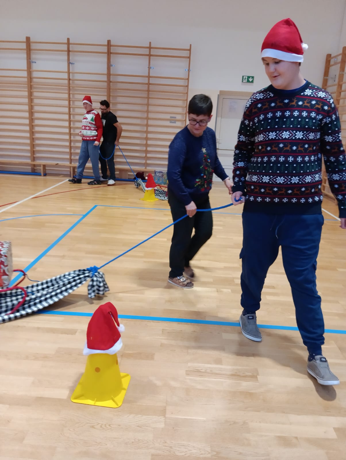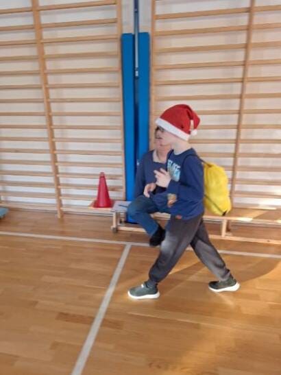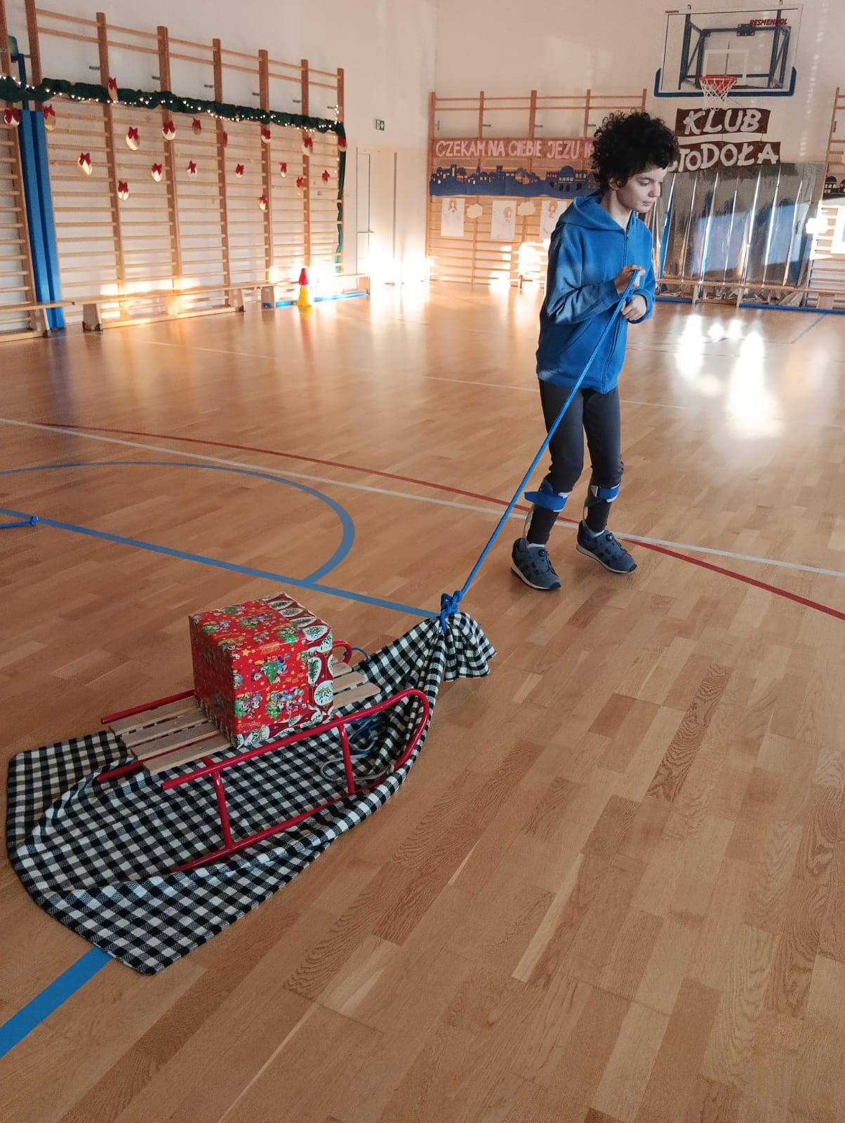 z nietypowymi konkurencjami. Uczniowie w ćwiczeniach i wyścigach korzystali z przyborów takich jak : czapeczki, prezenty, worki małe i duże, sanki, piłeczki, tunele, pachołki. Wszyscy wykazali się ogromnym zaangażowaniem, ciesząc się z przygotowanych atrakcji. Tym razem wyjątkowo, każdy uczestnik otrzymał oprócz medalu, słodką nagrodę. Pamiątkowe zdjęcia na szkolnej tablicy będą przypominały nam o świetnej zabawie.