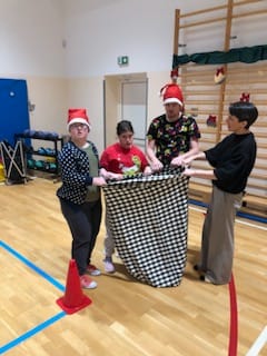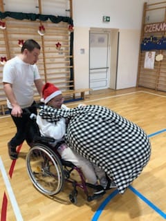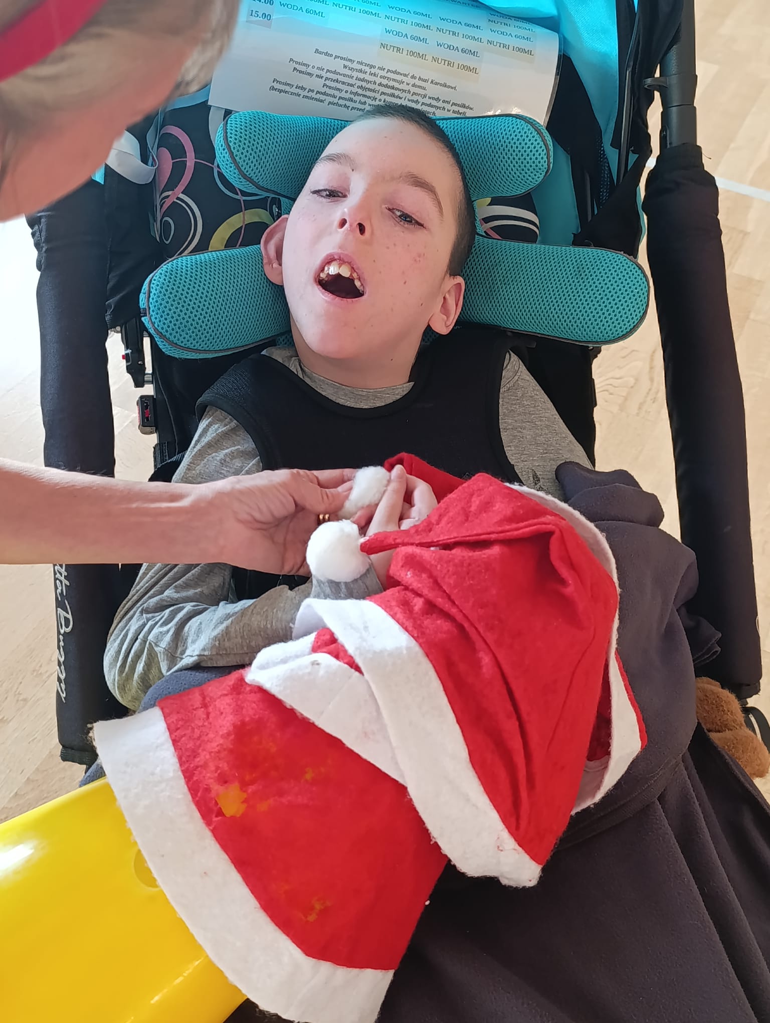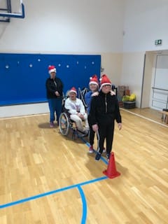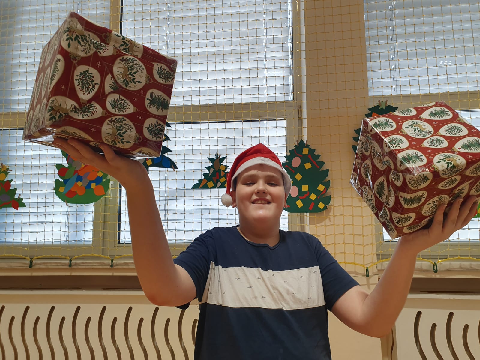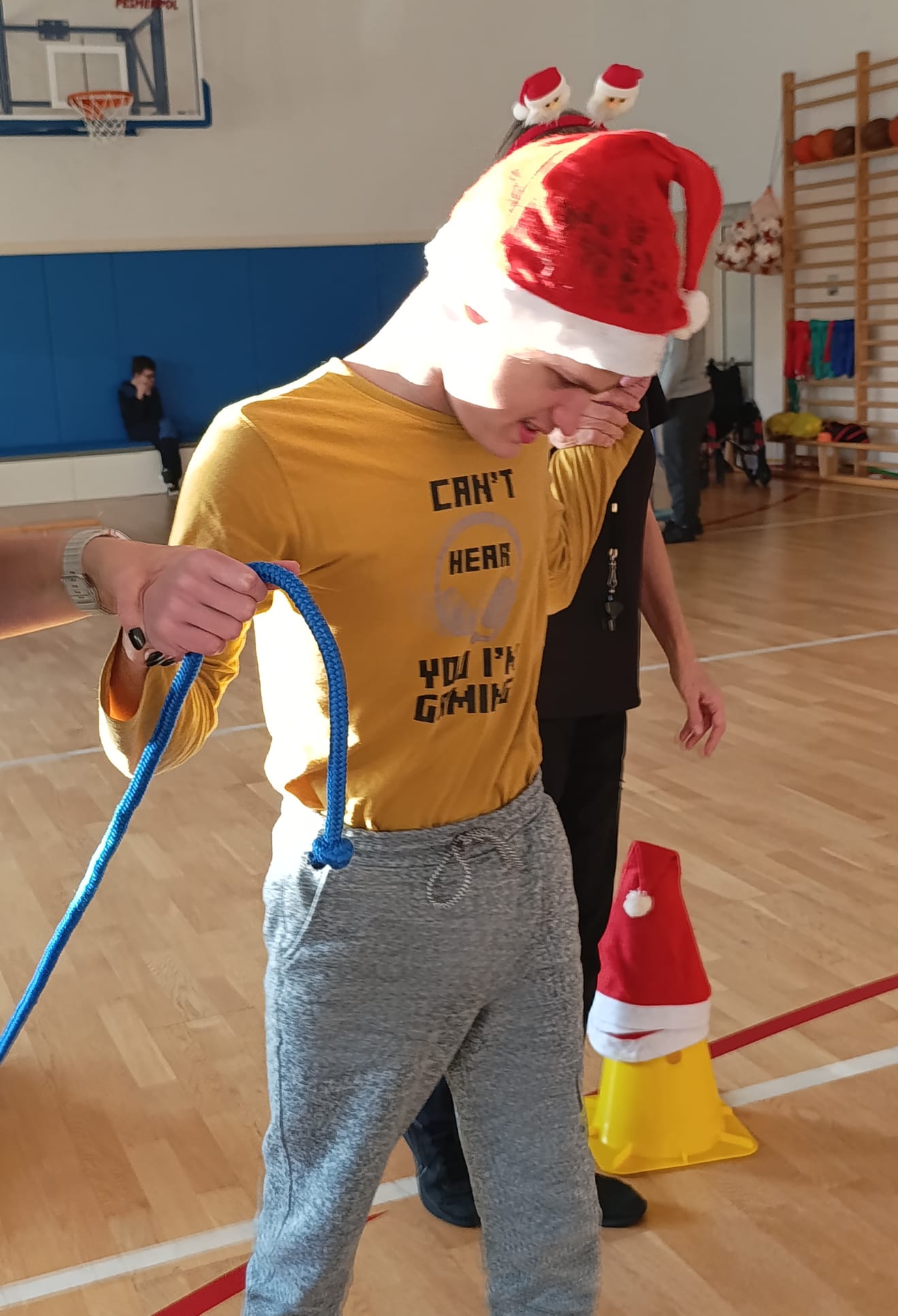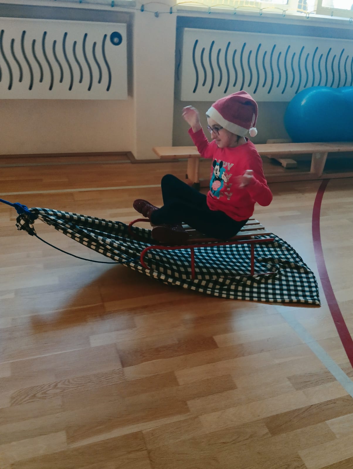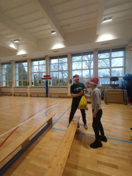 z nietypowymi konkurencjami. Uczniowie w ćwiczeniach i wyścigach korzystali z przyborów takich jak : czapeczki, prezenty, worki małe i duże, sanki, piłeczki, tunele, pachołki. Wszyscy wykazali się ogromnym zaangażowaniem, ciesząc się z przygotowanych atrakcji. Tym razem wyjątkowo, każdy uczestnik otrzymał oprócz medalu, słodką nagrodę. Pamiątkowe zdjęcia na szkolnej tablicy będą przypominały nam o świetnej zabawie.