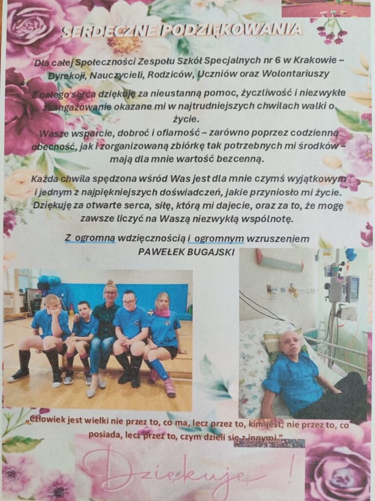 Dziękujemy za codzienną cierpliwość, życzliwość i wsparcie, jakie otrzymywał od Państwa jako uczeń szkoły specjalnej. To dzięki Państwa zaangażowaniu i ciepłu Pawełek mógł czuć się bezpiecznie, akceptowany i otoczony troską.
